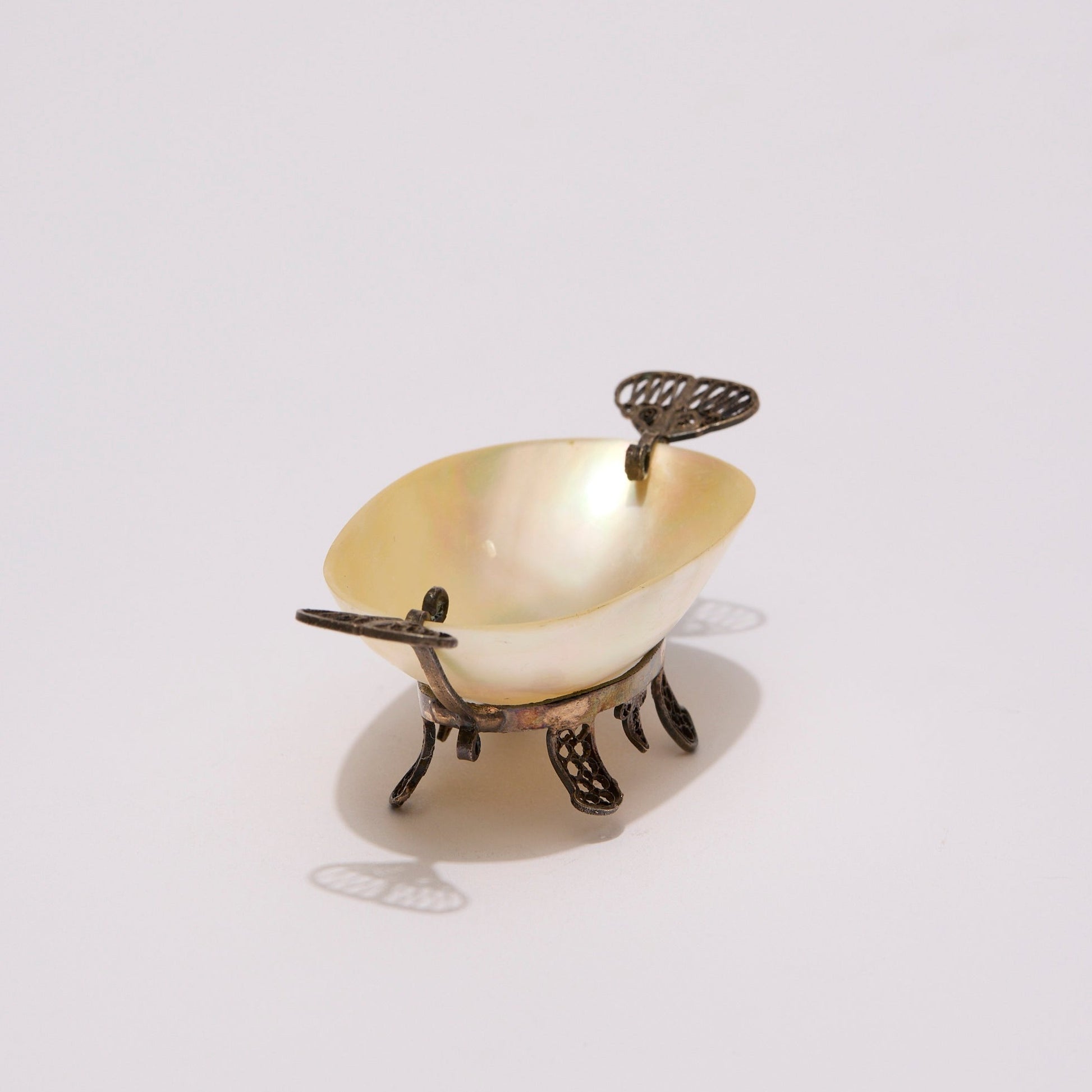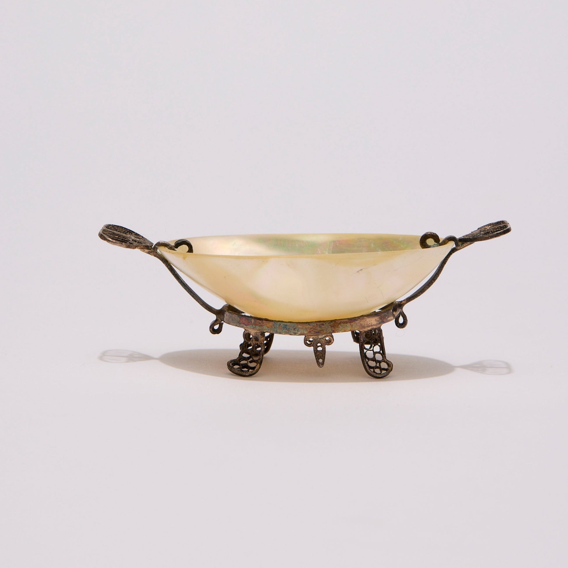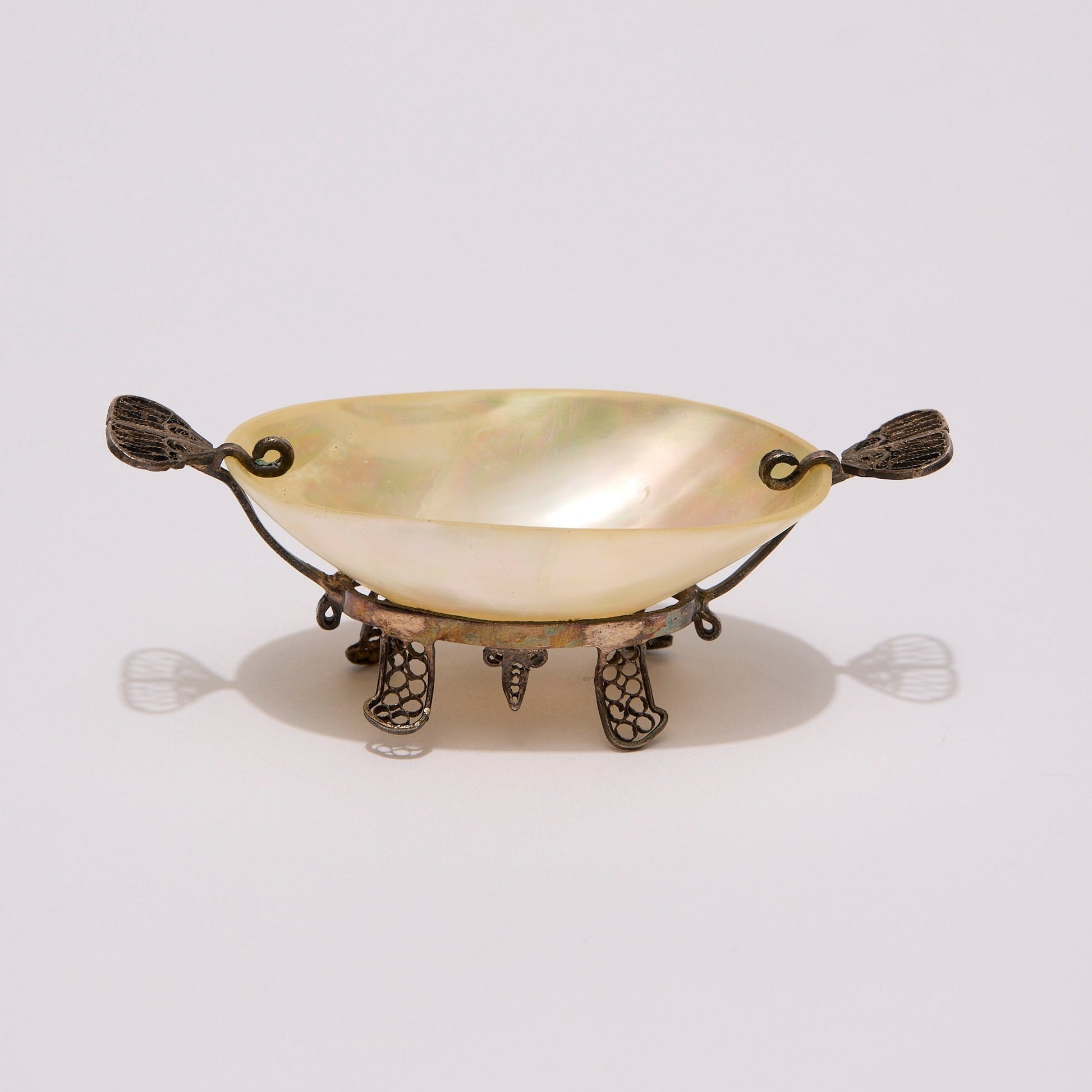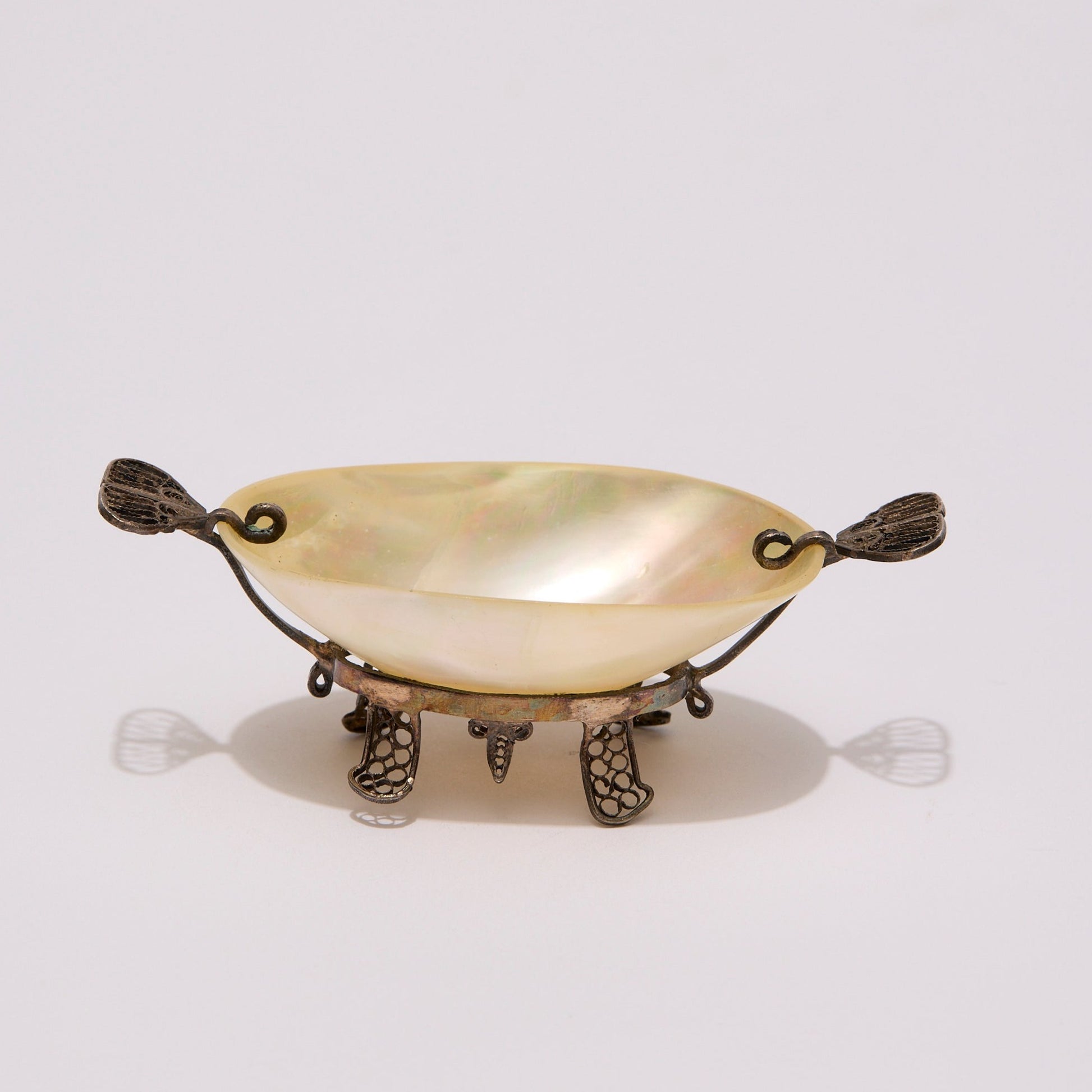 Just as at home on your dining table as your bedroom vanity, serve up condiments to a meal or place it on your dresser as a ring holder. Featuring mother-of-pearl shell and filigree silver footing.