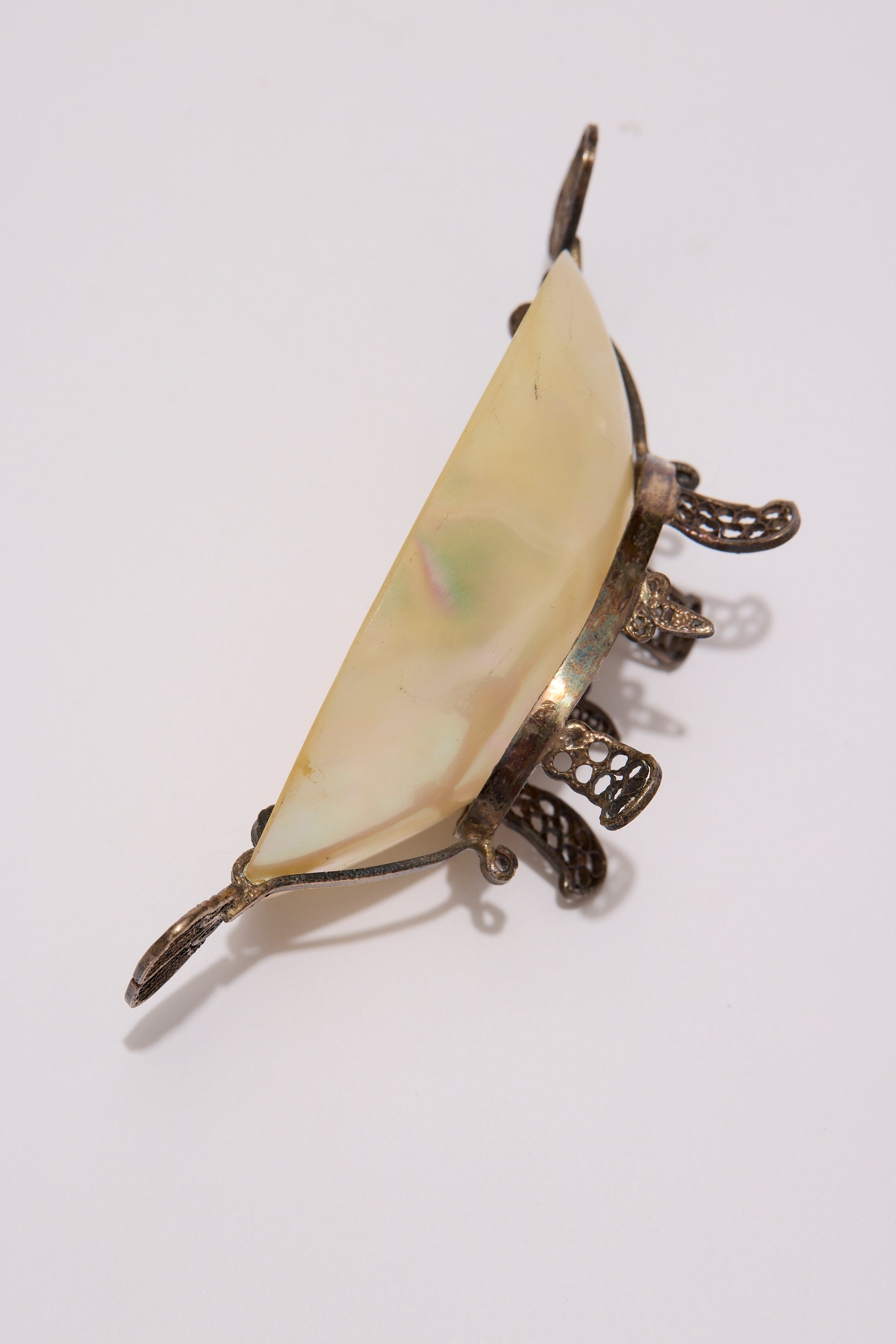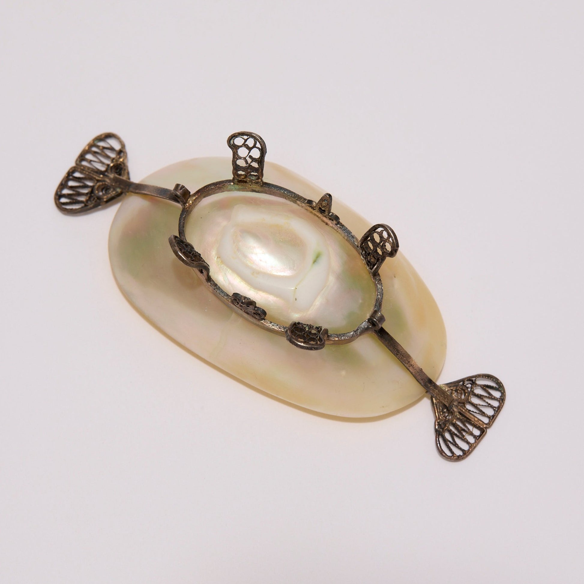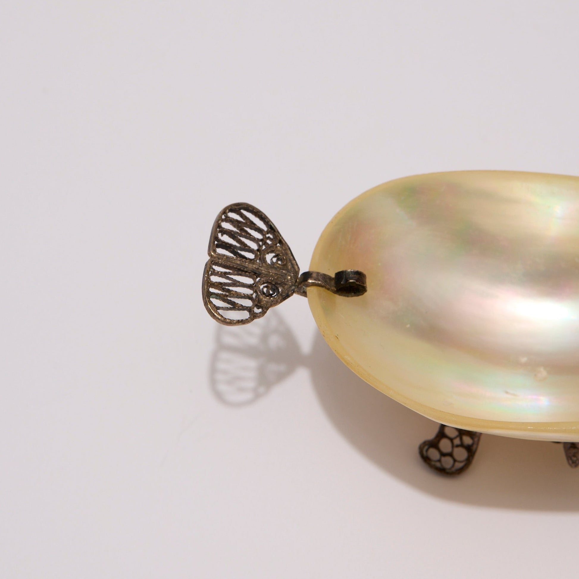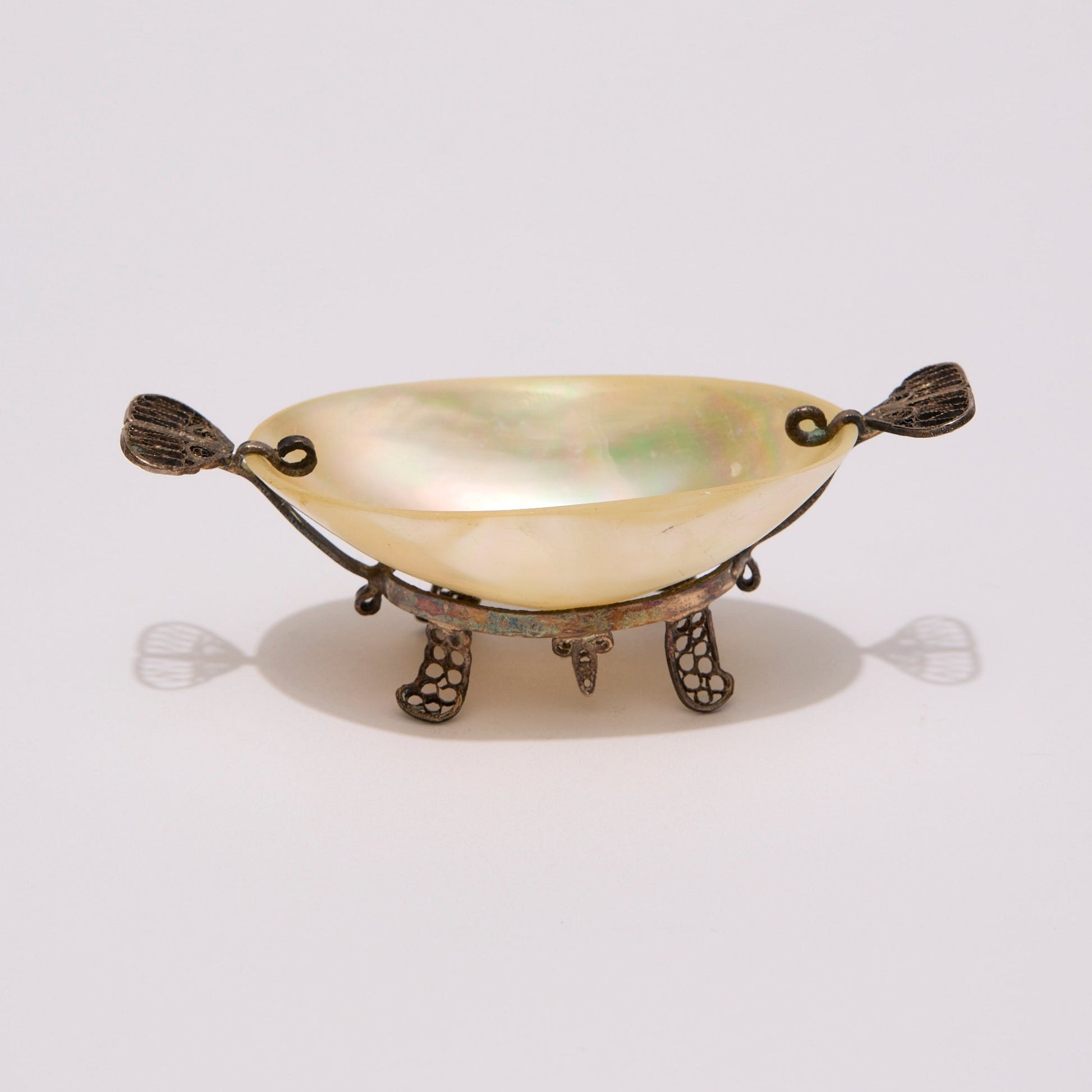 Just as at home on your dining table as your bedroom vanity, serve up condiments to a meal or place it on your dresser as a ring holder. Featuring mother-of-pearl shell and filigree silver footing.
